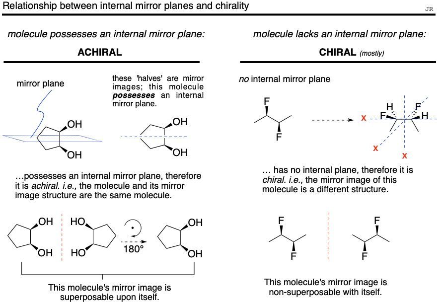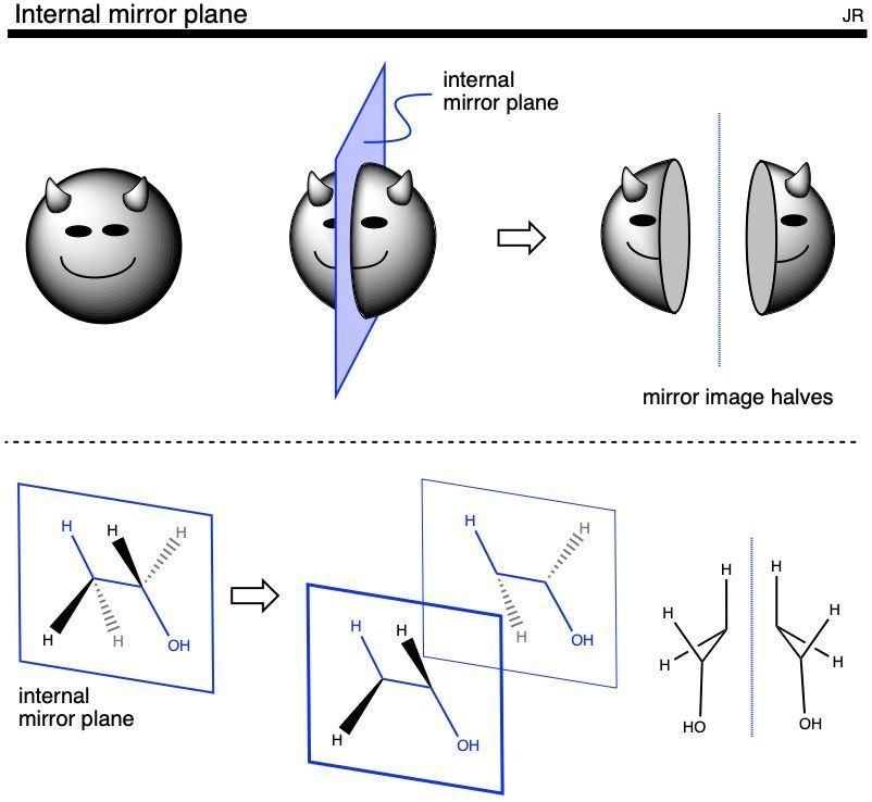 - Any structure that possesses an internal mirror plane is achiral, and it could not possibly be part of an enantiomeric pair. i.e., the molecule’s mirror image is simply itself.