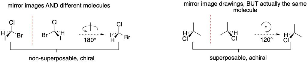 A compound that cannot be superposed upon its mirror image structure is a chiral compound. Conversely, molecules that are superposable upon there mirror image structure are achiral compounds. The mirror image structure of a chiral molecule will always be a different molecule, while the mirror image structure of an achiral molecule will be the same molecule, just viewed from a different perspective. The term chiral comes from the Greek word for ‘hand’, and you will often hear chiral explained in terms of ‘handedness’.